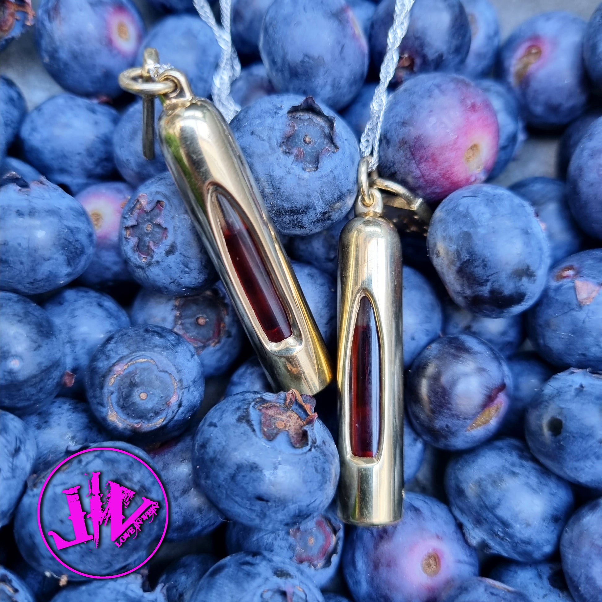 2 x Brass pendant sheaths suspended on 24" Stainless Steel ballchain, enclosing 1" hand-blown glass vials